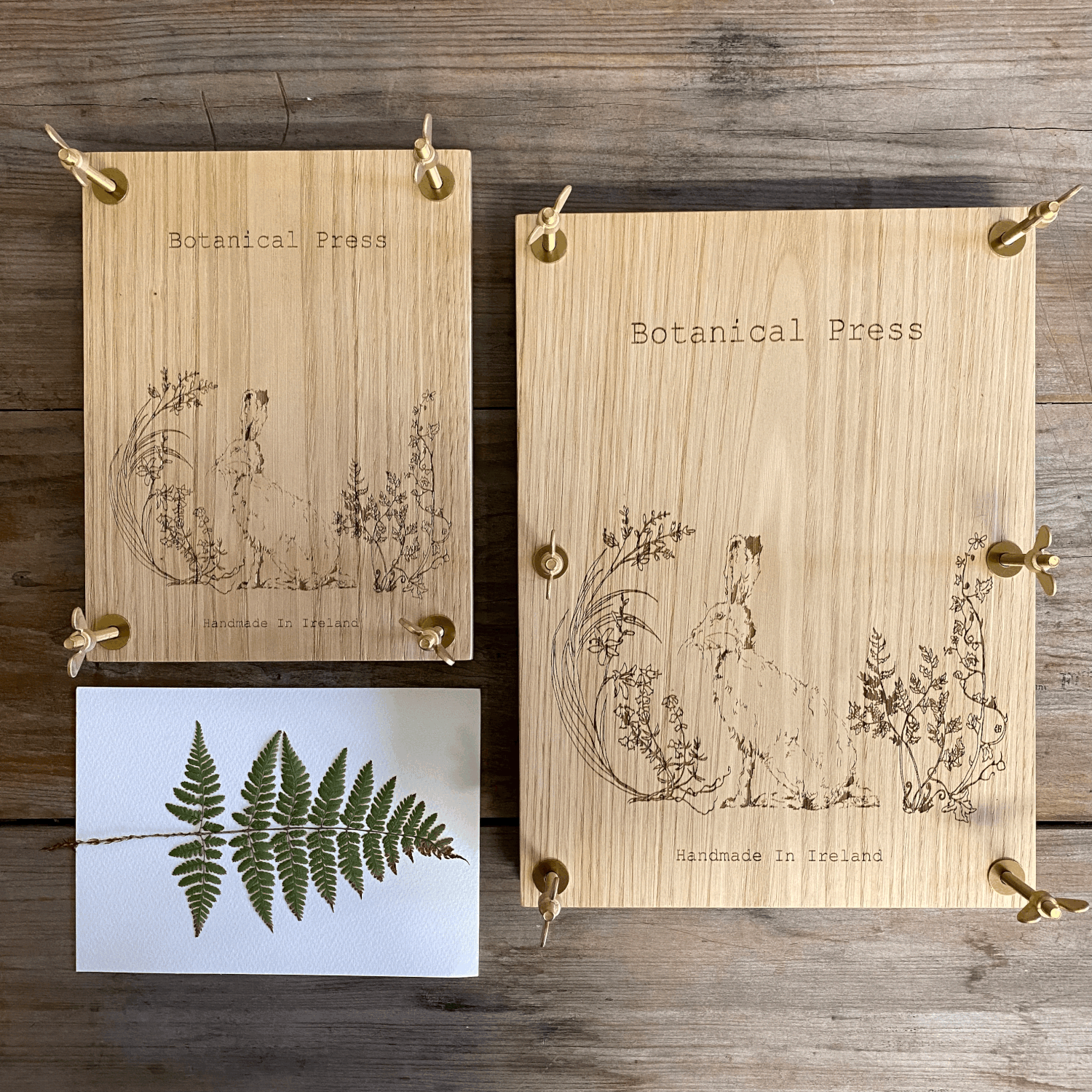Irish company, The Flower Press Company create handmade flower presses in two sizes, A4 and A5, in either Sycamore or Chestnut veneer - engraved with their beautiful logo of a wild hare.